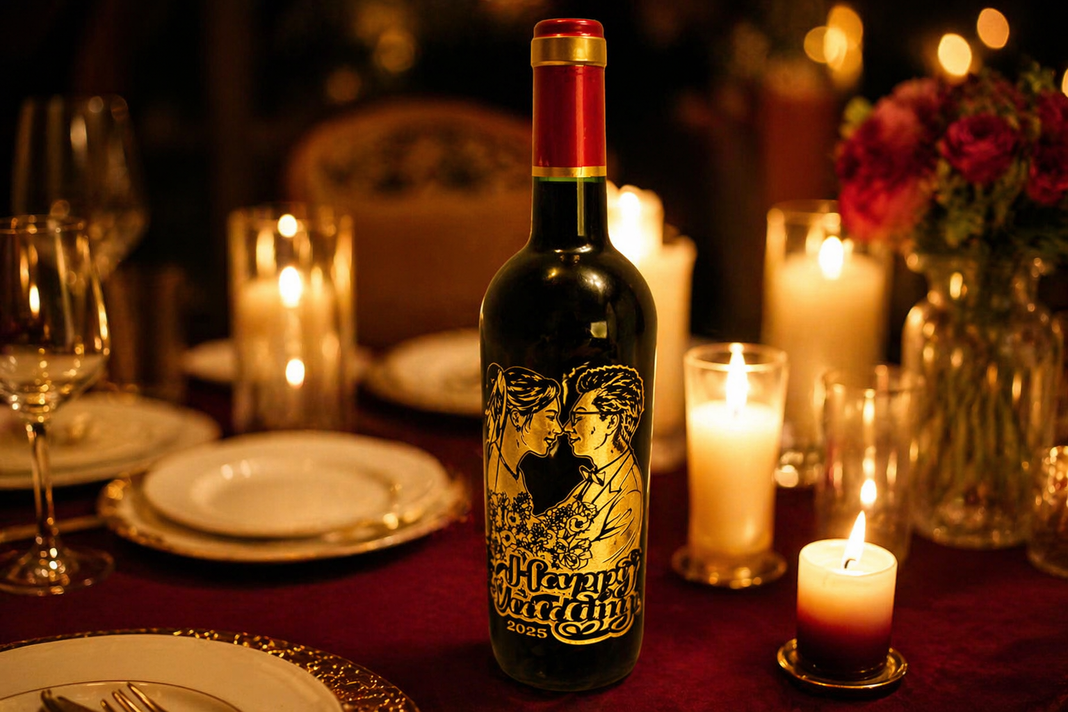 結婚紀念酒是一種將重要時刻具象化的禮物形式,透過雕刻技術將照片與文字刻印於酒瓶上,形成具有長期保存價值的紀念品。